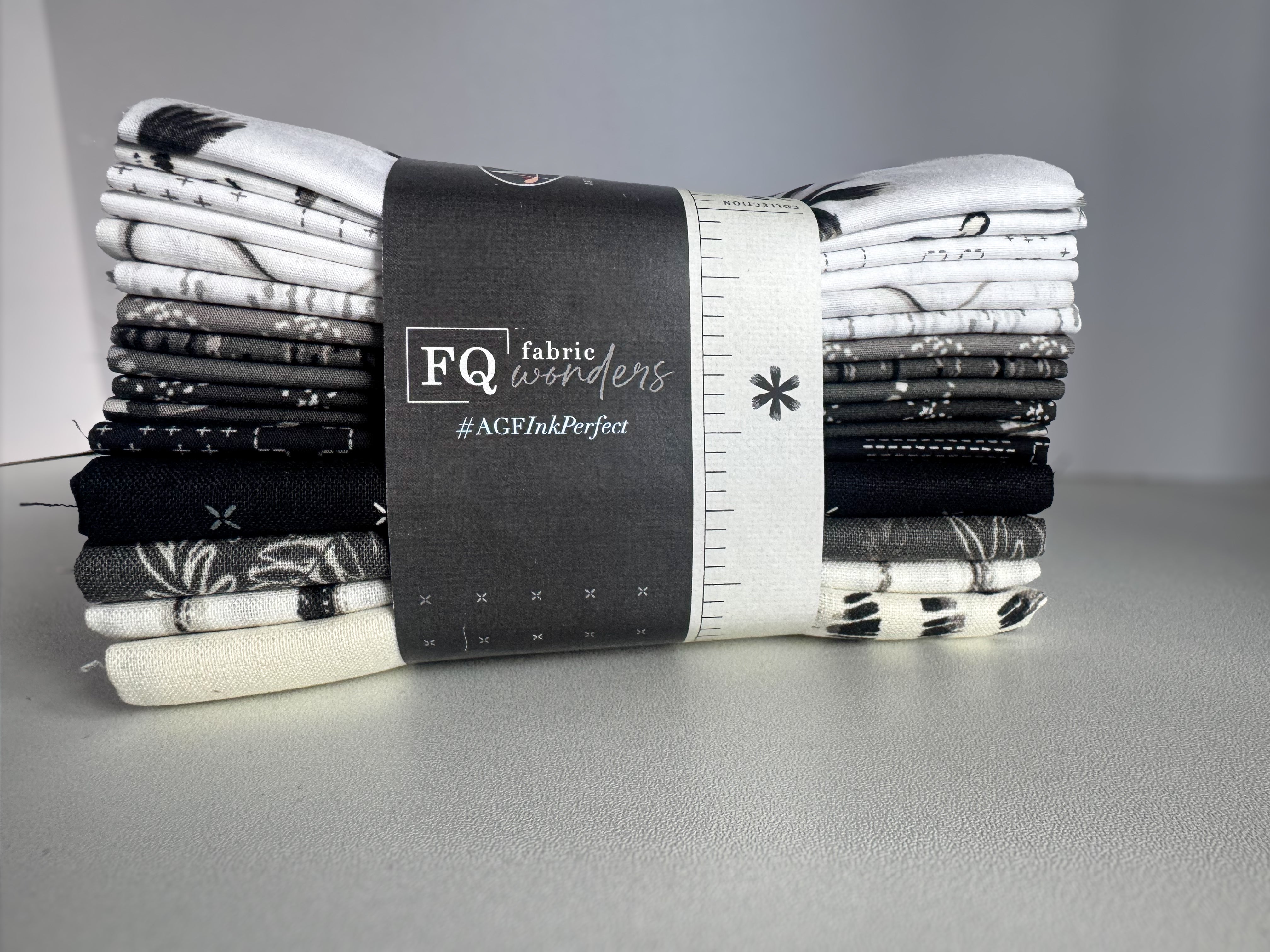 12 FQs 100% quilting-weight cotton + 4 FQs (bottom row of the grid) are 55% linen/45% cotton blend, with slightly heavier weight.