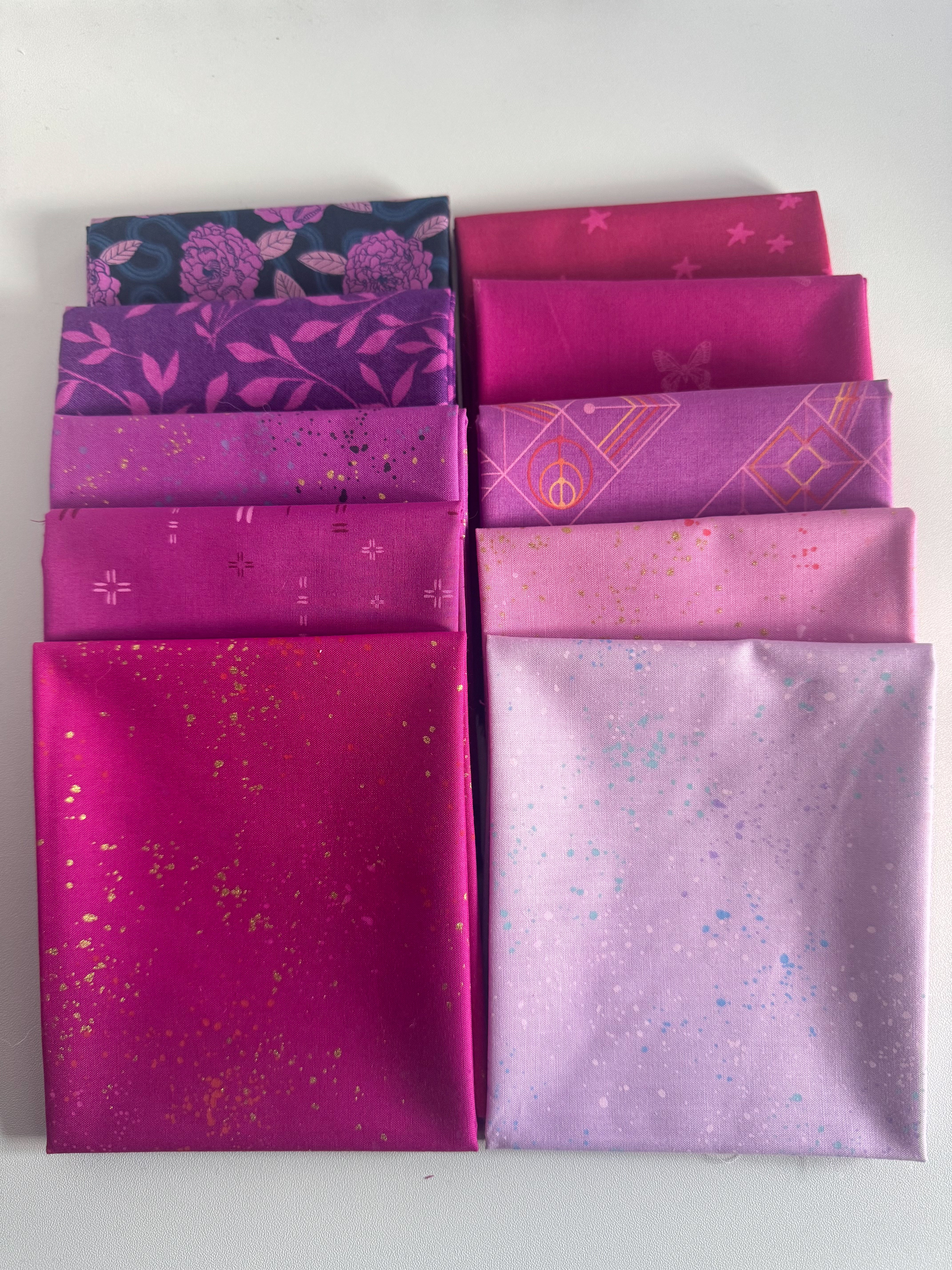 Ten fat quarters in a rich spectrum of purples from saturated magenta and phlox to deep plum, soft lilac, and airy lavender. All prints (from subtle blenders to a couple of bolder moments) were thoughtfully chosen to add depth, movement, and drama.