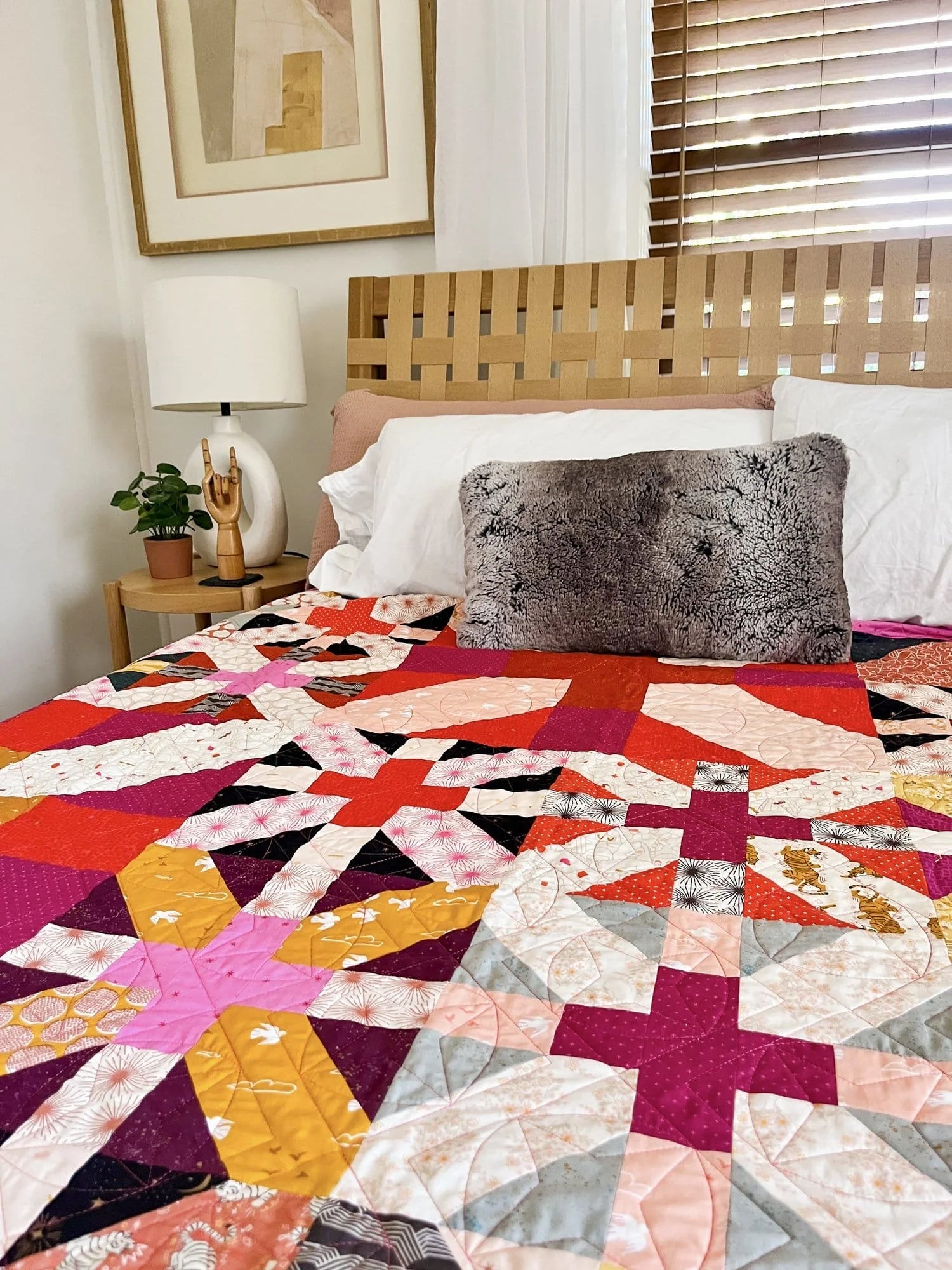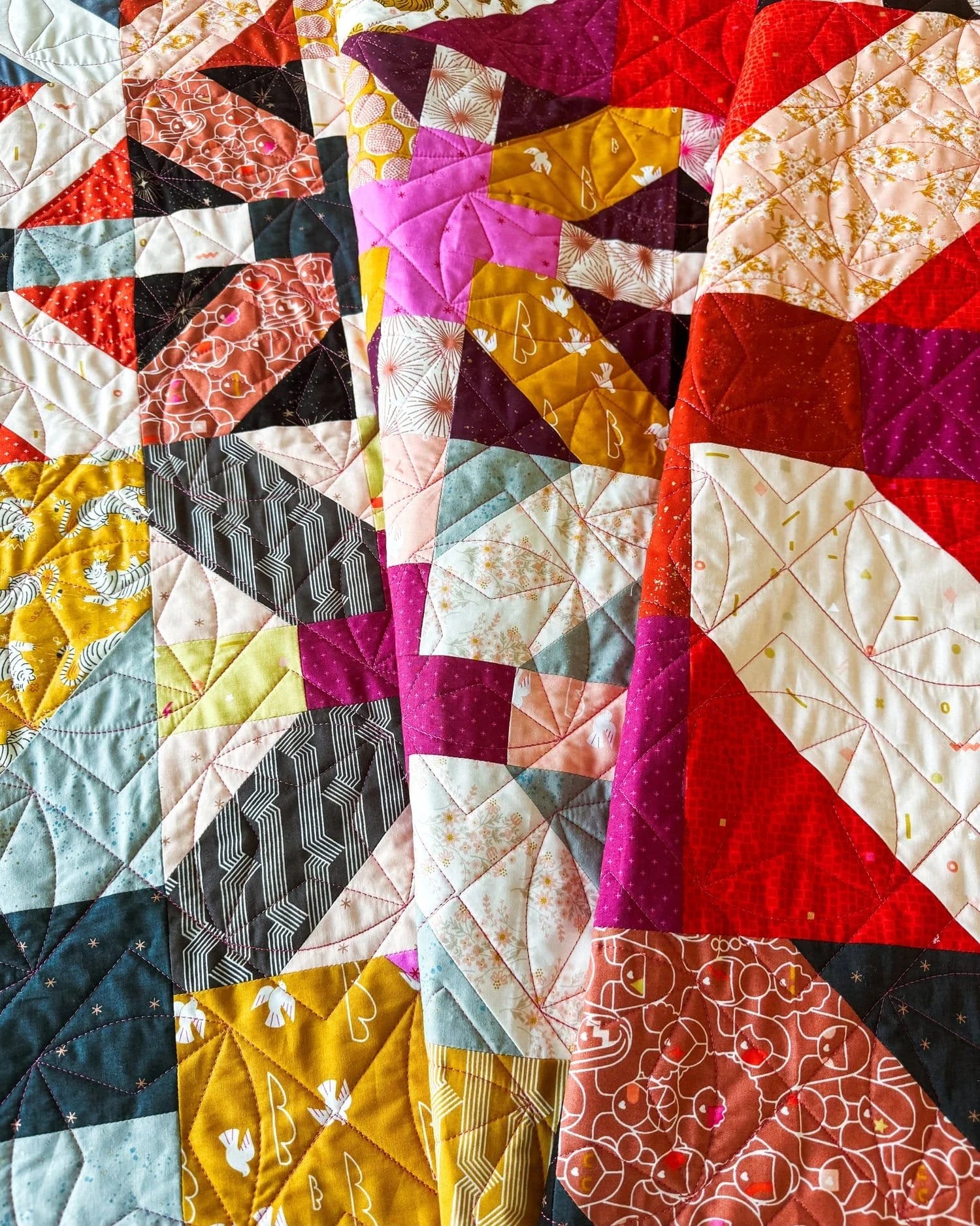The Hear Me Roar quilt is made from super soft designer cottons in radiant prints from the Sunbeam fabric collection by Rashida Coleman-Hale; look closely to see the superstar women, the birds, and the fierce roaring tigers. The quilt pattern is called Double Crossed by Angela Pingel Designs.