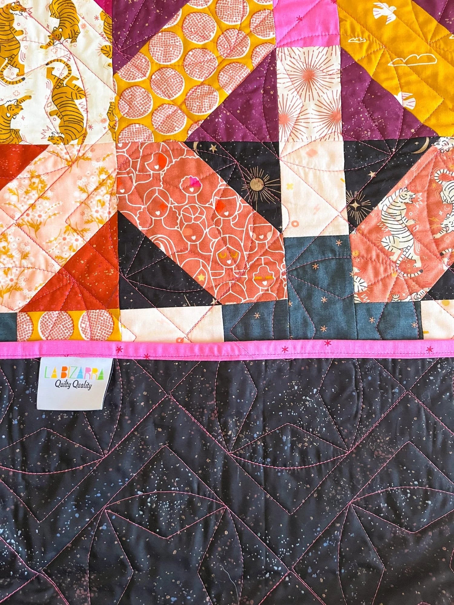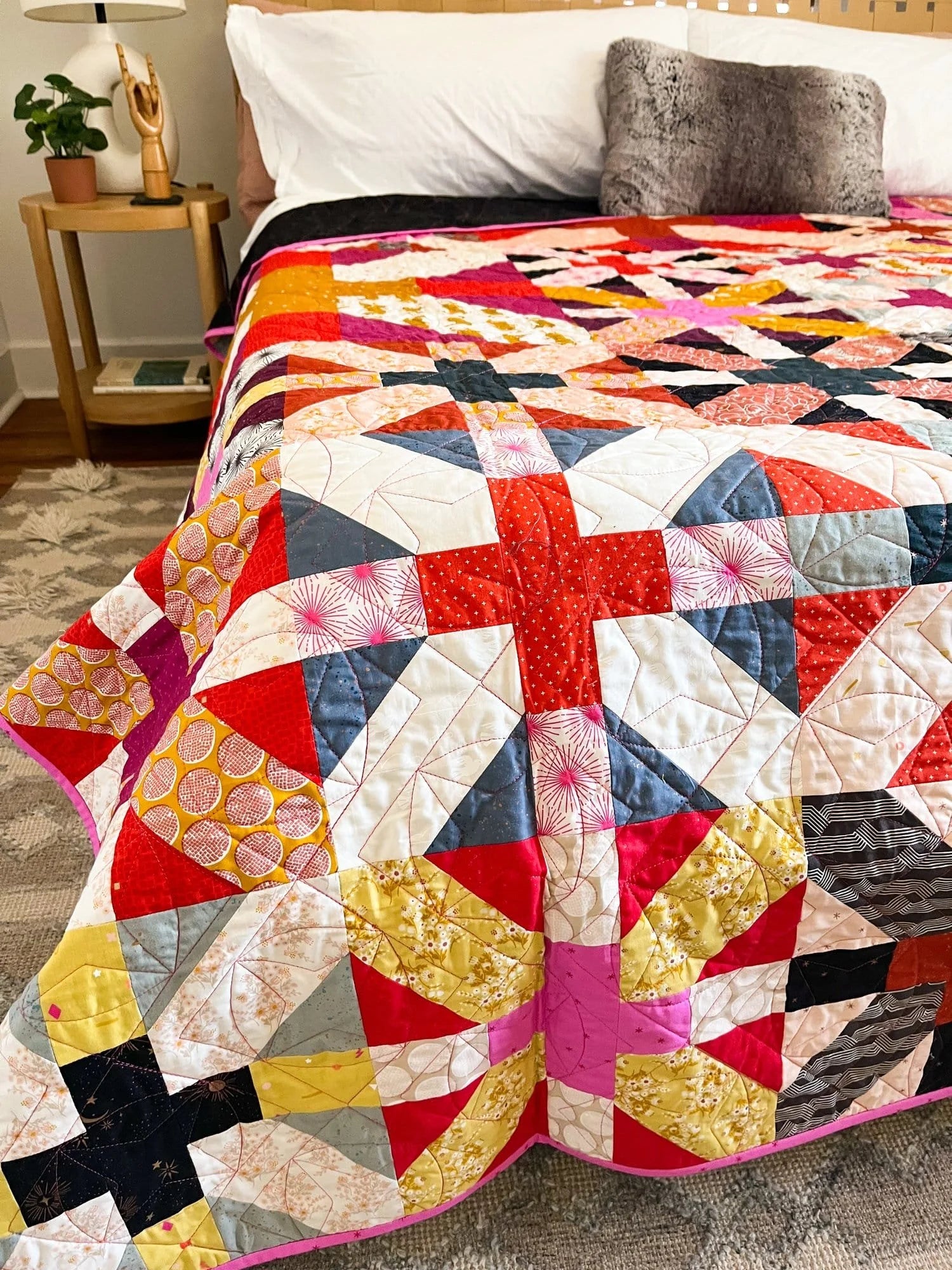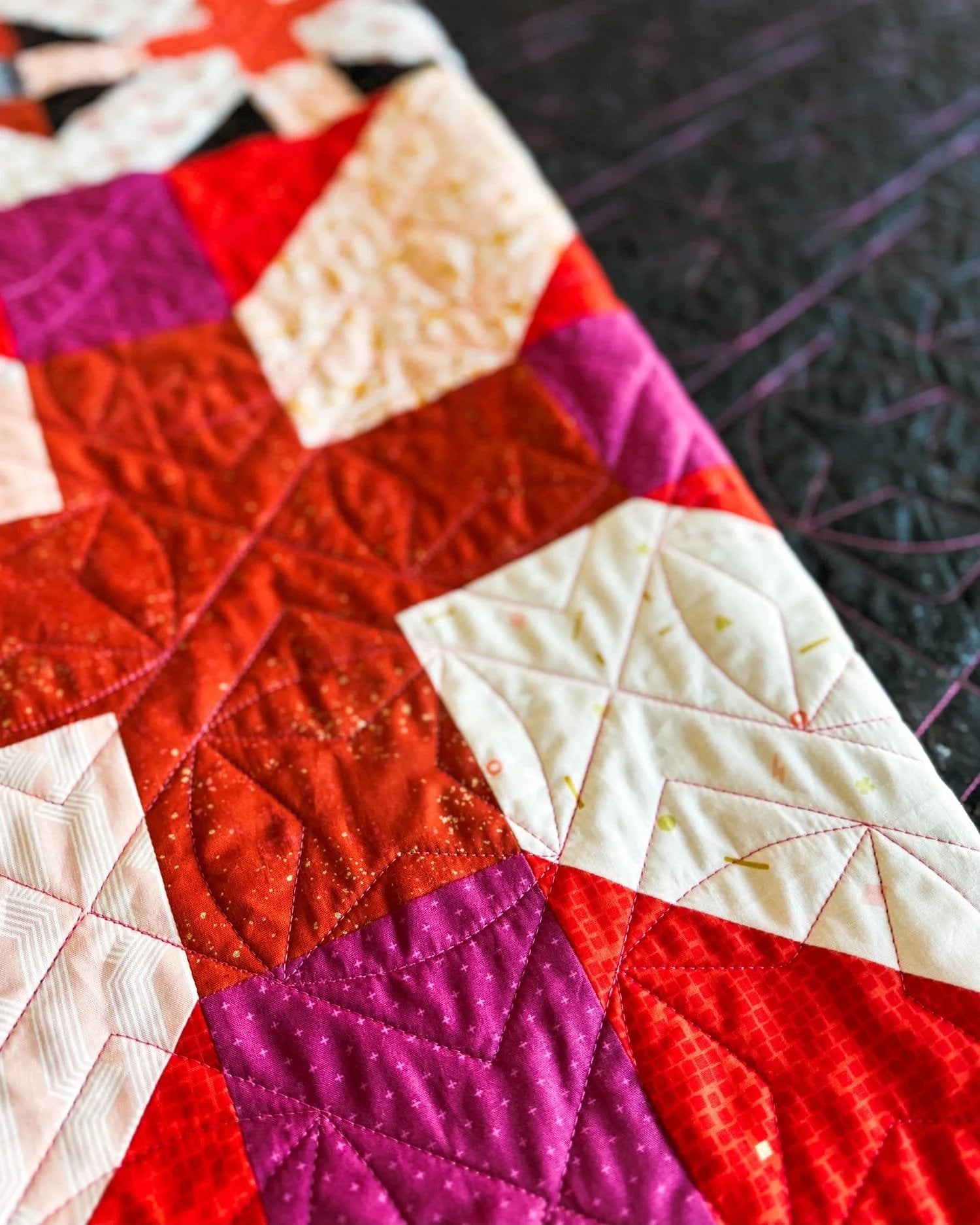 In a red hot array of colors from berry red to pastel pink to bright yellow to pewter gray to black to caramel, this is quilted with hot pink thread by longarm quilter Meghan of A Piece of Quiet Quilts. A bright pink binding frames up those classic x-plus blocks. The backing is beautiful speckled black sateen.