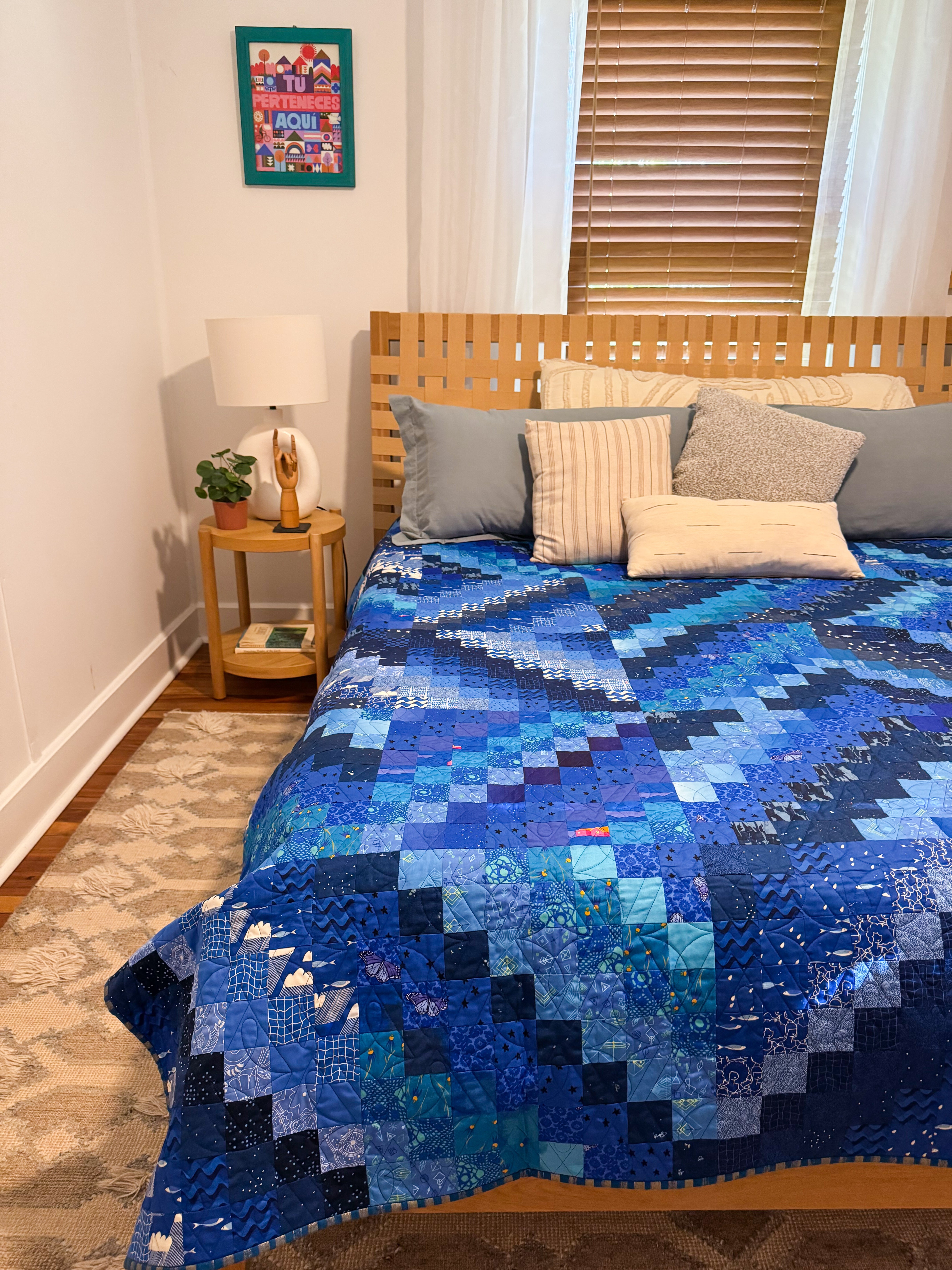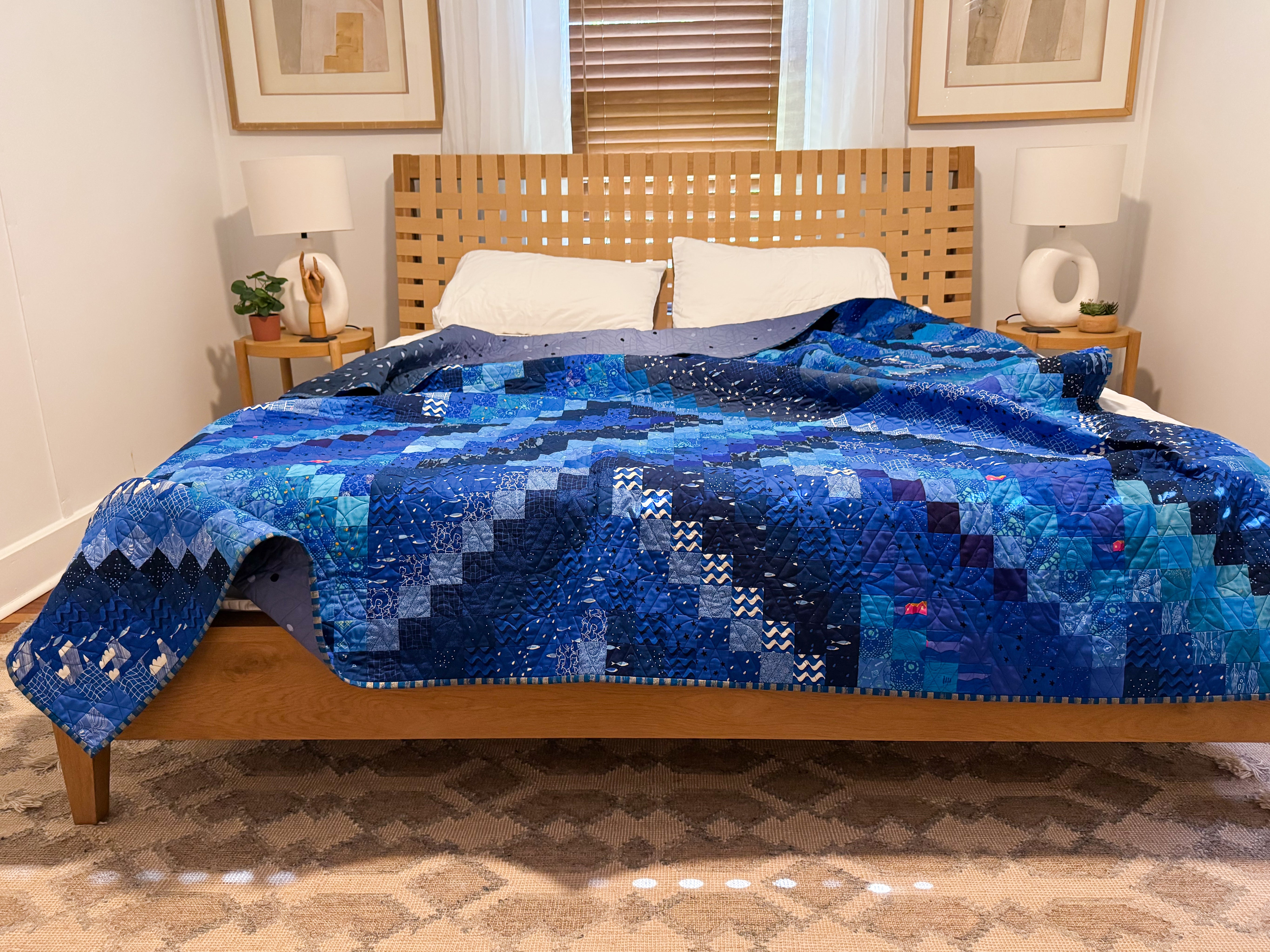 • Professionally quilted with bold blue thread by longarmer Meghan of A Piece of Quiet Quilts